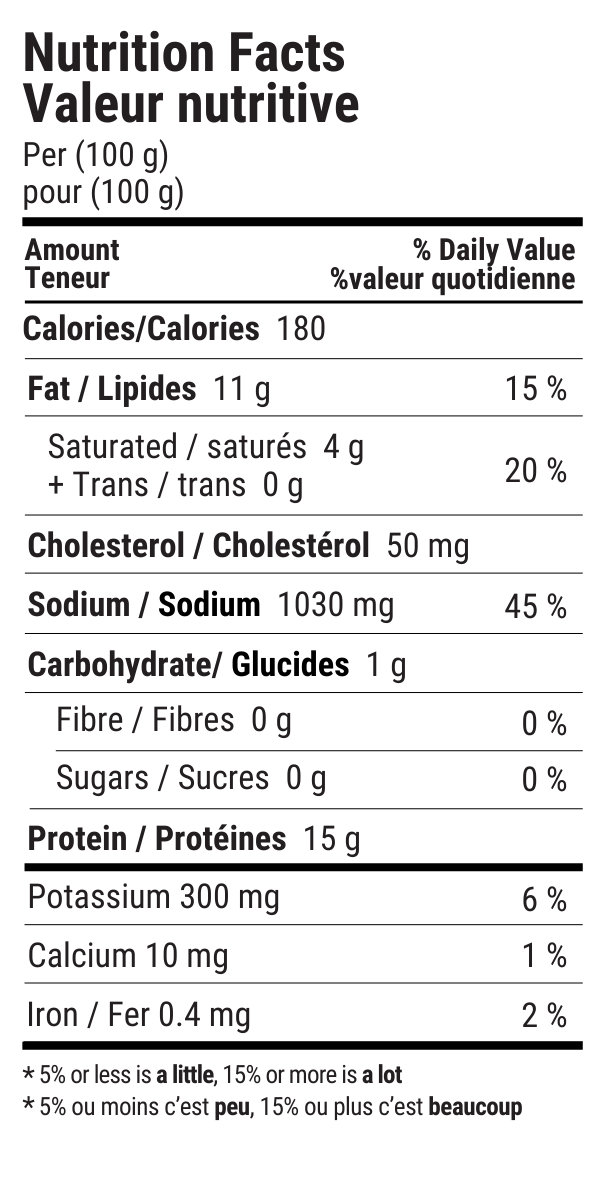 Select Canadian pork legs are hand-trimmed and cured in small batches. The ham is netted and delicately smoked naturally with maple hardwood. Always tender and moist, this ham is guaranteed to satisfy the most discerning palate.